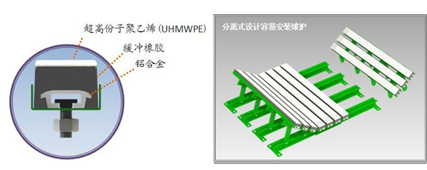 2.礦用緩沖條可減緩物料由高處落下時帶來沖擊力,緩沖條表面為低磨耗超高份子聚乙烯材質,降低了輸送帶與緩沖條之間磨擦力.