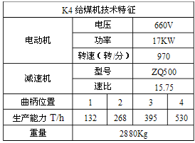 K4給煤機(jī)技術(shù)特征 電動機(jī) 電壓 660V 功率 17KW 轉(zhuǎn)速(轉(zhuǎn)/分) 970 減速機(jī) 型號 ZQ500 速比 15.75 曲柄位置 1 2 3 4 生產(chǎn)能力T/h 132 268 395 530 重量 2880Kg 保證每一臺給煤機(jī)正常連續(xù)工作,才能確保 原煤的暢通運(yùn)輸,否則每一臺給煤機(jī)的故障,都不同程度的影響生產(chǎn)產(chǎn)量。