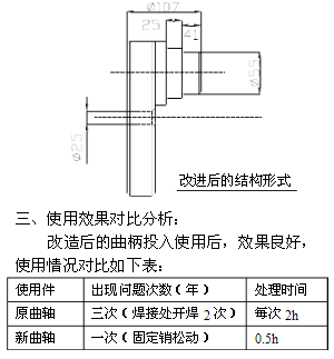 由以上對比可以明顯看出,改進(jìn)后事故率明顯降低,沒有出現(xiàn)焊接件開焊問題,僅出現(xiàn)固定銷松動一次,處理時間只用了半小時。新、舊曲軸對比改進(jìn)后可以增加效益(按較小煤量200噸/h、有50%的處理時間在生產(chǎn)班計算):3.5×50%×200×400=140000元,再減去增加的制造費(fèi)用3500元(雖然曲柄的重量小,但是由于改進(jìn)后的新曲軸加工工藝較為復(fù)雜,制造價格有所增加),每年可為礦增加的效益還是十分明顯。