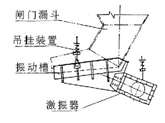 電機(jī)不參振的單質(zhì)體振動(dòng)給煤機(jī)由給料槽體、激振器、電機(jī)、電機(jī)支座、撓性聯(lián)接、吊掛組件、閘門、密封罩等部件組成。