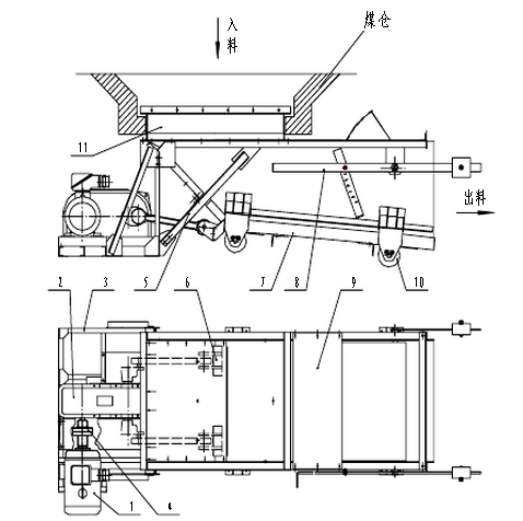 圖1 GMW系列往復(fù)式給料機結(jié)構(gòu)示意圖 1.隔爆電動機 2.減速機 3.傳動機架 4.聯(lián)軸器 5.H形架 6.曲柄連桿裝置 7.給料底板 8.閘門 9.機架體 10.滾輪體 11.漏斗